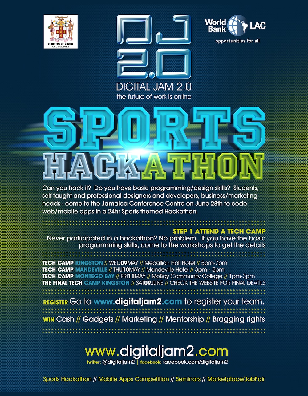 When: The Hackathon takes place on Thursday, June 28th, 2012, the first of the 3 day Digital JAM 2.0 event at the Jamaica Conference Centre.